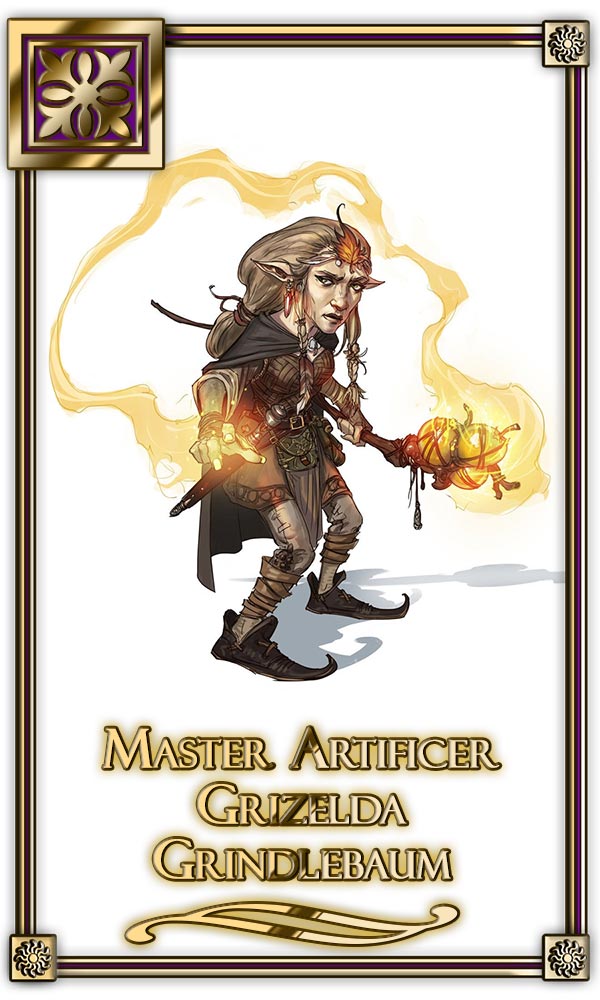 The group is then sent by the Sword Captain to restock potions at Sorcerous Sundries. The store is a ramshackle stone hovel specializing in potions and poultices, run by a gnomish artificer named Grizelda Grindlebaum. She has a standing contract to provide magical draughts to the Purple Dragons, and shares some sort of history with Sabranic.