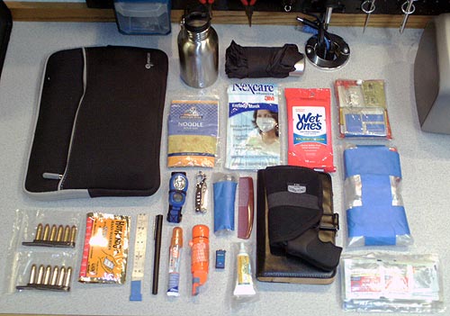 Electronics: • HP Netbook • CD/DVD Rom • USB Mouse • Small Network Cable • PC Screen Cleaning Wipe • 4 Gig Flash Cards • 4 Gig USB Drive • PC Roo Case • Power Cable Navigation & Communication: • Compass • Small Mirror • Whistle • Pre-paid Int. Phone Card • Signal Mirror Defense: • Ruger LCR .38 • 5 Rounds Power Ball .38 +P • 6 Rounds Golden Saber .38 +P • 6 Rounds Power Ball .38 +P Food/Water: • 2 Tablespoons Salt • 2 Tablespoons Sugar • 4x Life Savers Candy • Fishing Kit • Chicken Noodle Dinner • Frontier 20 Gallon Water Filter • 6x Katadyn Purification Tablets • Stainless Steel Water Bottle • Extra Fishing Line • 2x Beef Broth Packets |